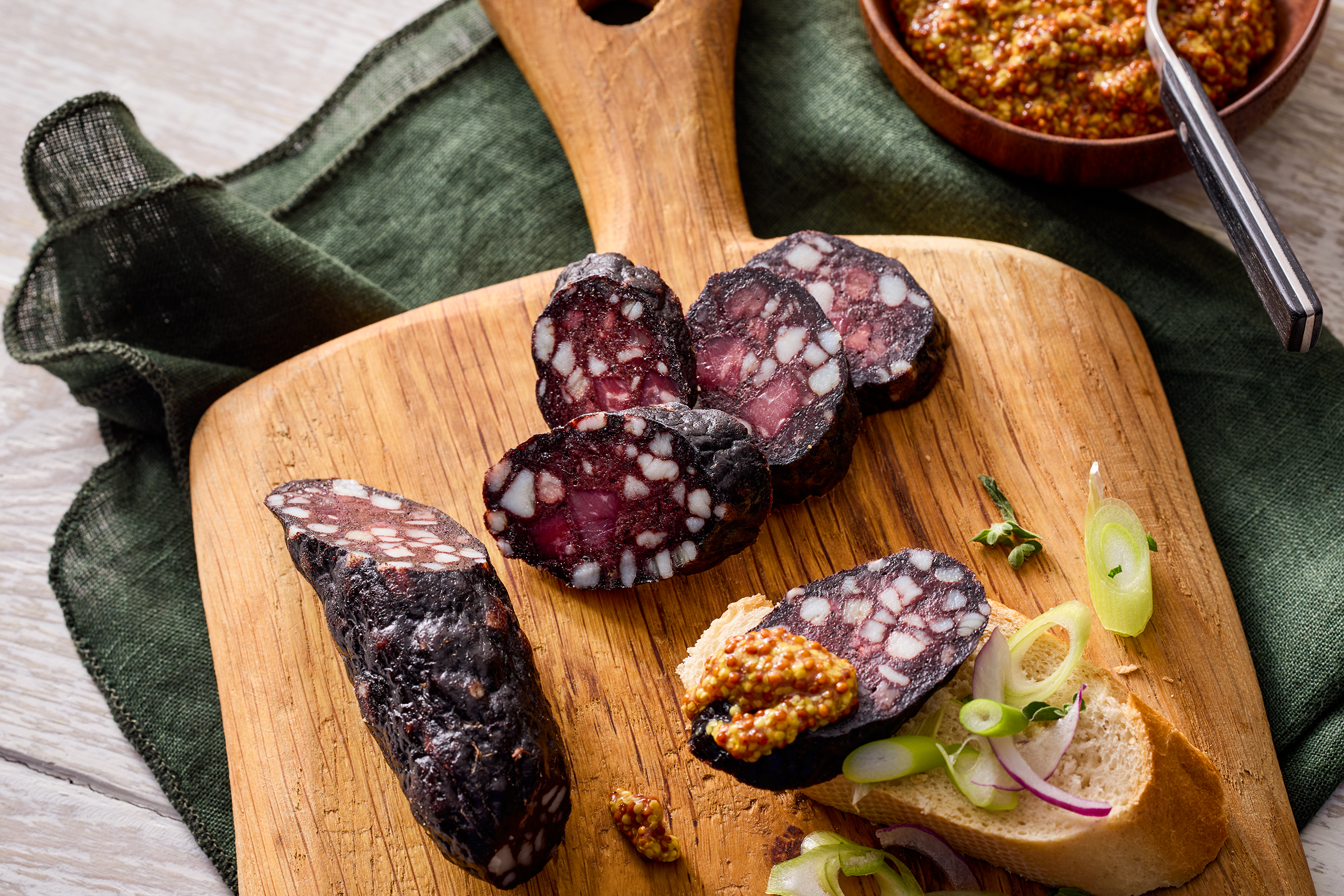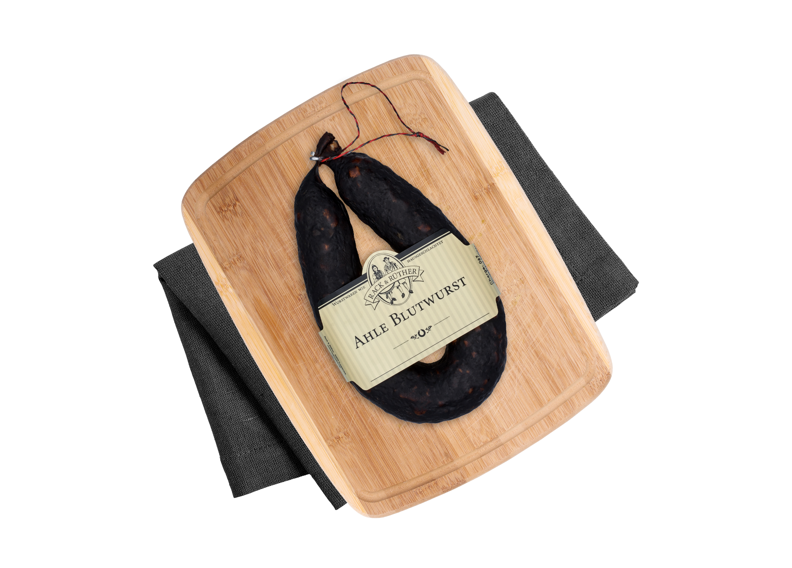 Die Ahle Blutwurst – nach Thüringer Wursttradition auch mit Leber – wird über Buchenholz geräuchert, über Wochen getrocknet und verliert dabei etwa 40% ihres Gewichts. So entsteht ein edel-kräftiger Geschmack.