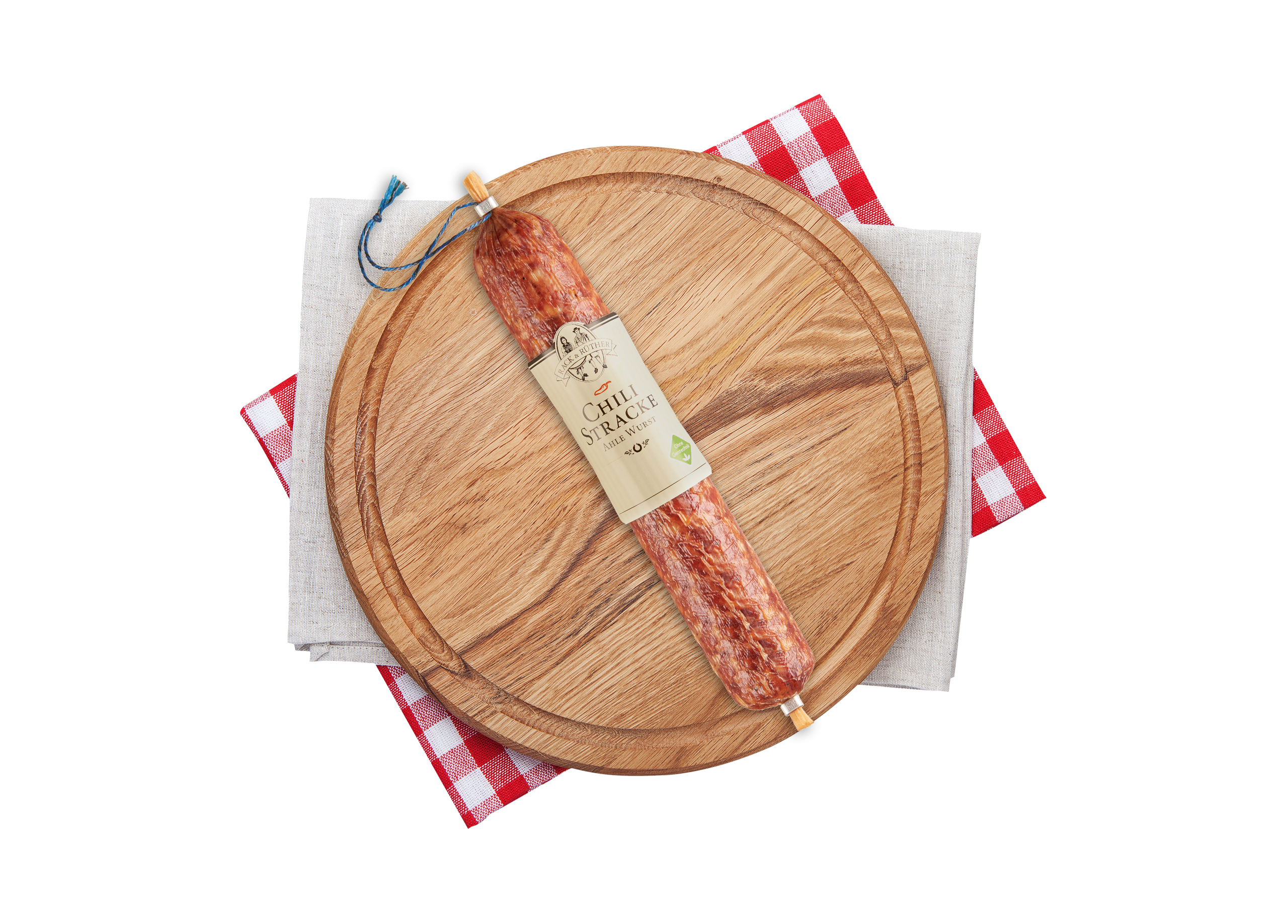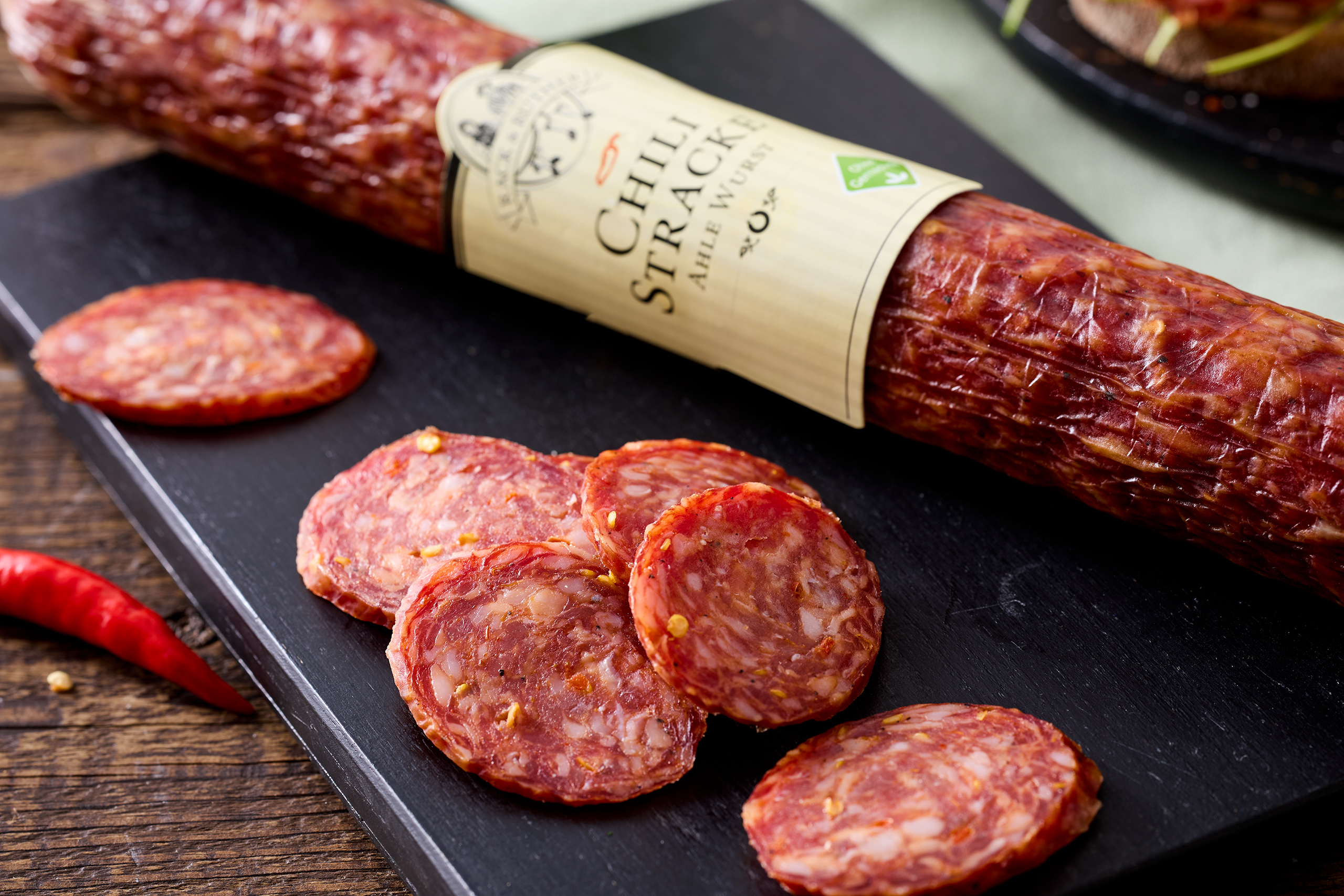 Achtung scharf! Unsere Chili Stracke hält, was ihr Name verspricht. Diese würzige Ahle-Wurst-Spezialität aus magerem Schulterfleisch und bestem Speck wird knackig mit Bio-Chili abgeschmeckt. Sie schmeckt fantastisch auf einem Weißbrot. Tipp: In dünne Scheiben geschnitten auch hervorragend für eine selbstgemachte Pizza geeignet.