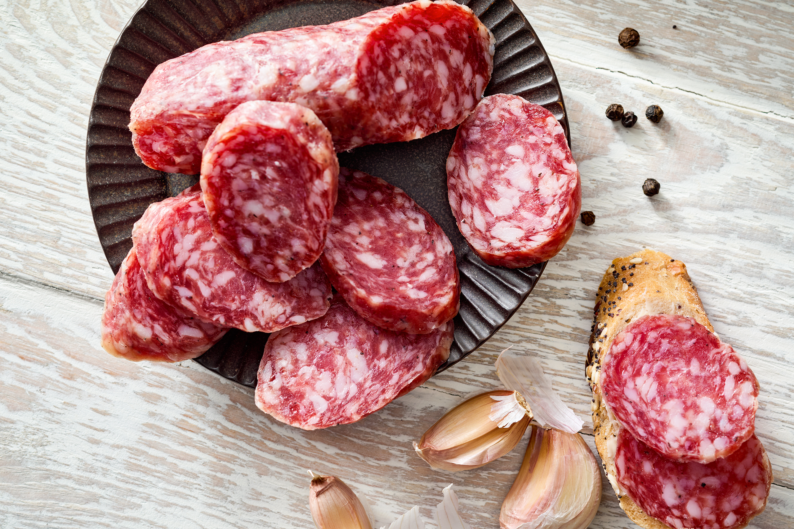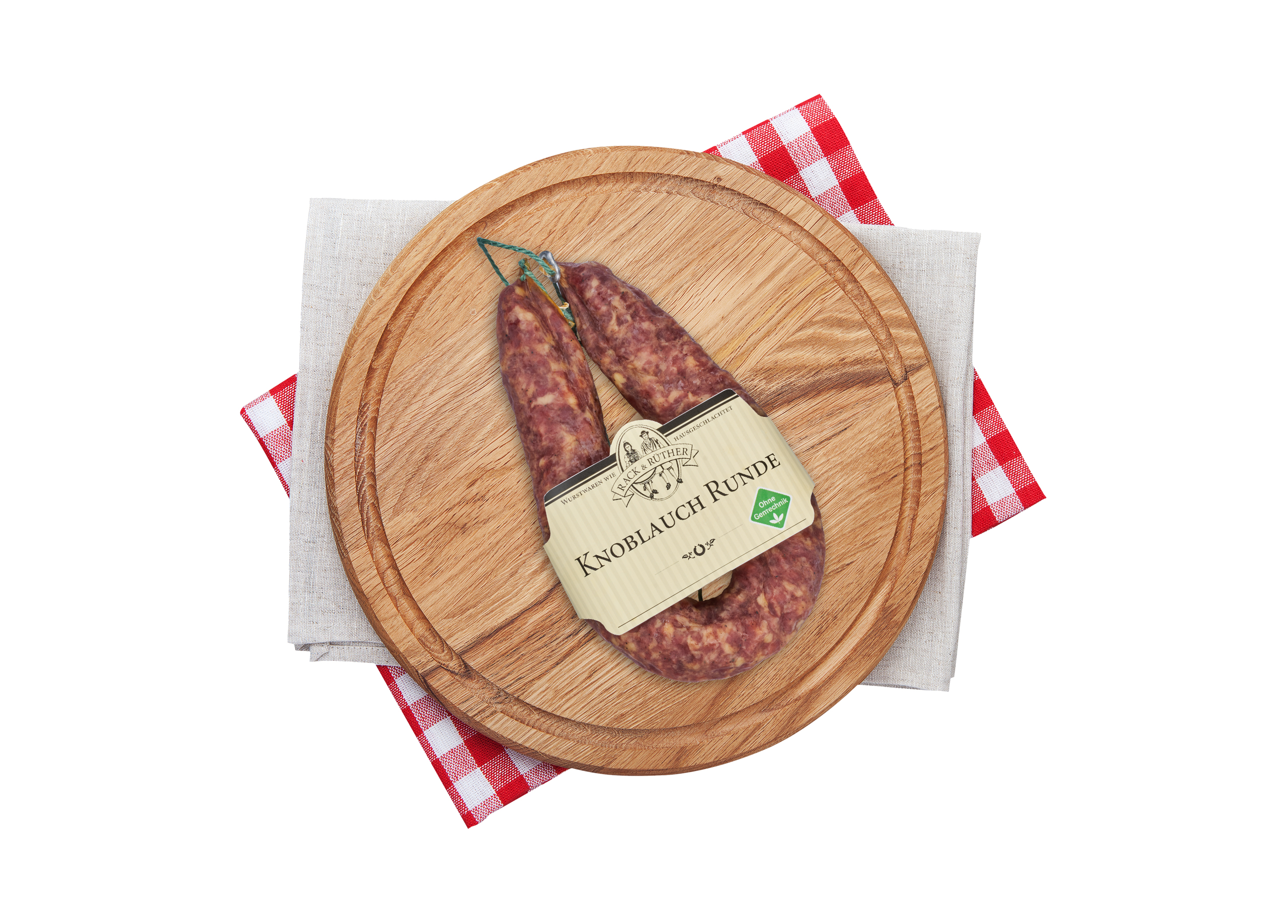 Herzhafte Rohwurst-Spezialität in der runden Variante. Fein abgeschmeckt mit Bio-Knoblauch im Rinderkranzdarm.